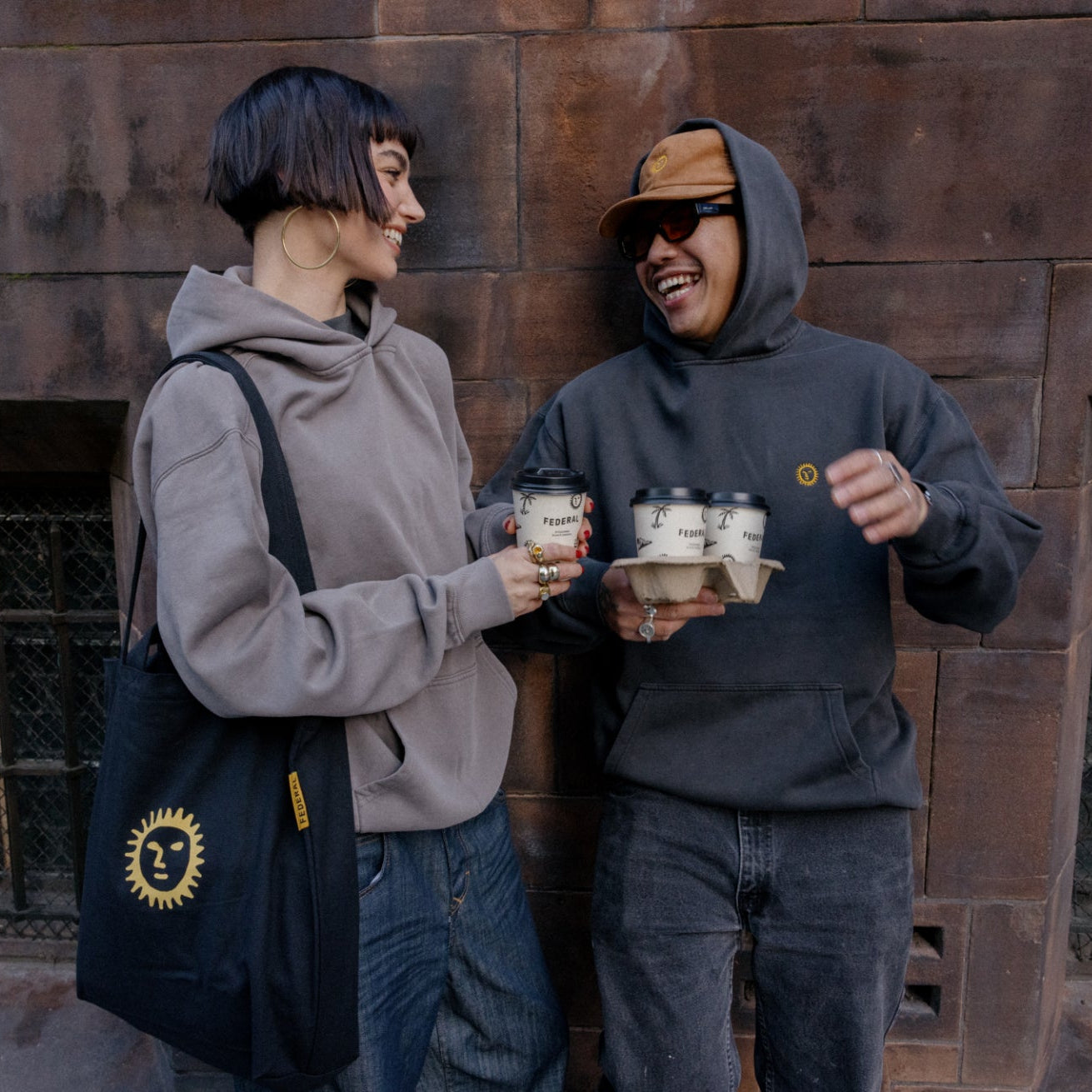 Our quality long-handled totes are made using 10oz black cotton canvas and screenprinted with our iconic Federal kiwi on one side, and logo on the other.